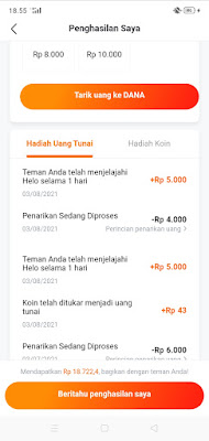 Dengan membagikan kode referal kepada calon member dan member tersebut berhasil menjadi anggota di Helo maka yang membagikan kode tersebut akan mendapatkan komisi atau berupa uang sebesar Rp 5000 secara langsung.